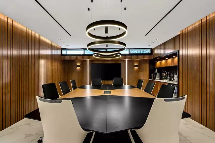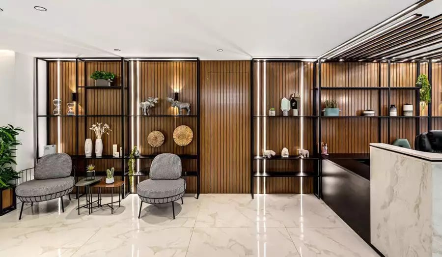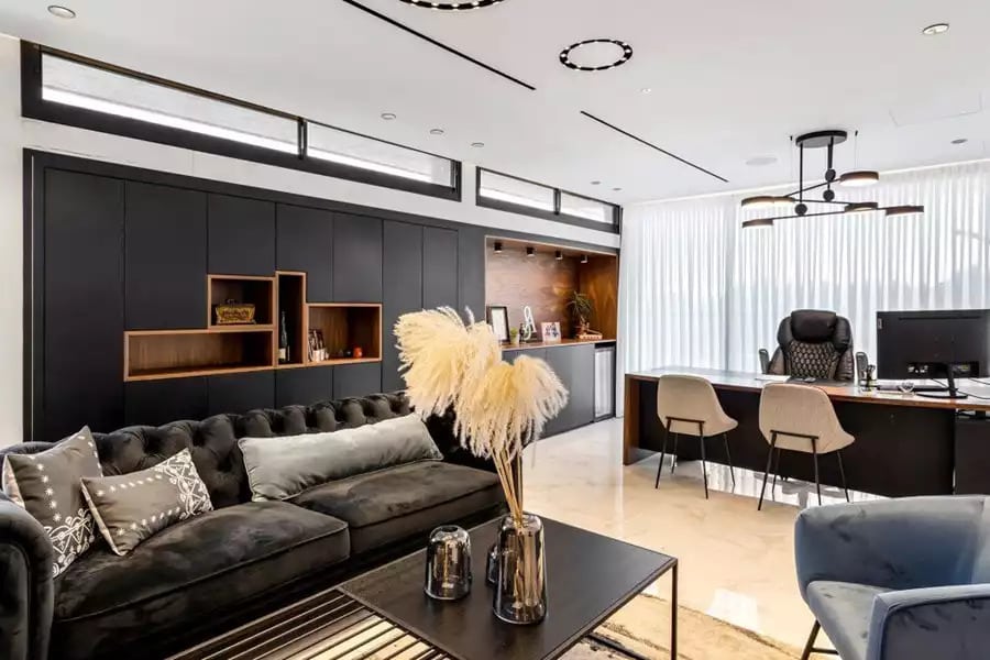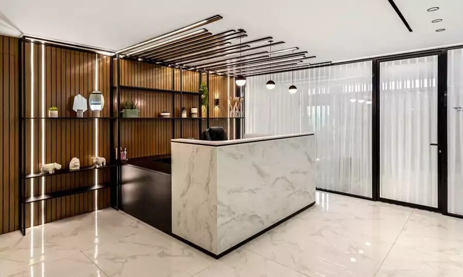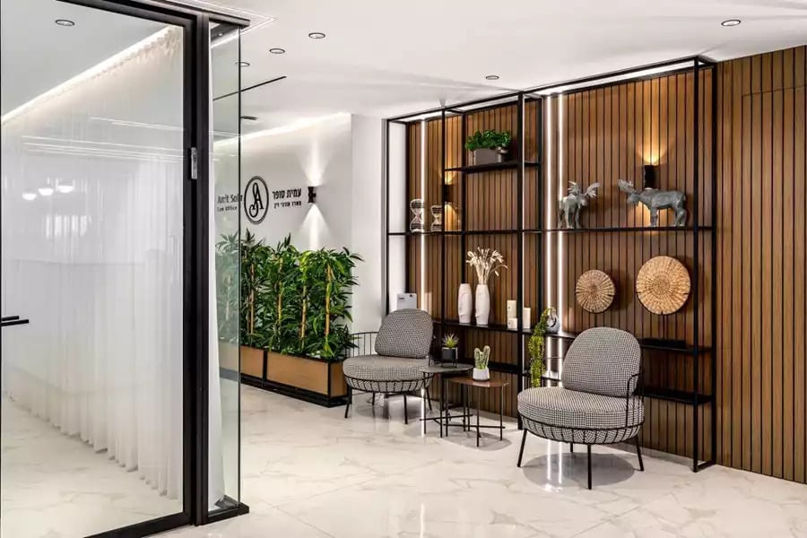 הרצפה כוסתה באריחים דמוי שיש בהירים, ששידרו יוקרתיות סולידית ועטפו את עמדת המזכירה בעוצמה. חיפוי פורניר עץ אגוז מחורץ נבחר כדי להעניק לחלל תחושה קלילה אך עדיין רשמית, וספת קפיטונאז' מקטיפה נבחרה על פני העור המסורתי והמנוכר. גופי תאורה עדינים שולבו במראה המשכי מהכניסה לעבר חדר המנכ"ל, ונגרות משולבת ברזל ומתכת שנעשתה בטיילור מיד- נתנו את הטאץ' האישי.